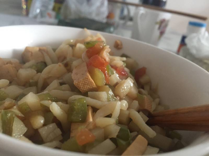 3:最后倒入调味料,撒上花生、豌豆,点缀葱花即可。