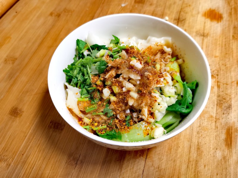 14:碗里放点葱姜末、香菜、炸干葱花、辣椒油、盐、味精、花椒面、陈醋、香油备用