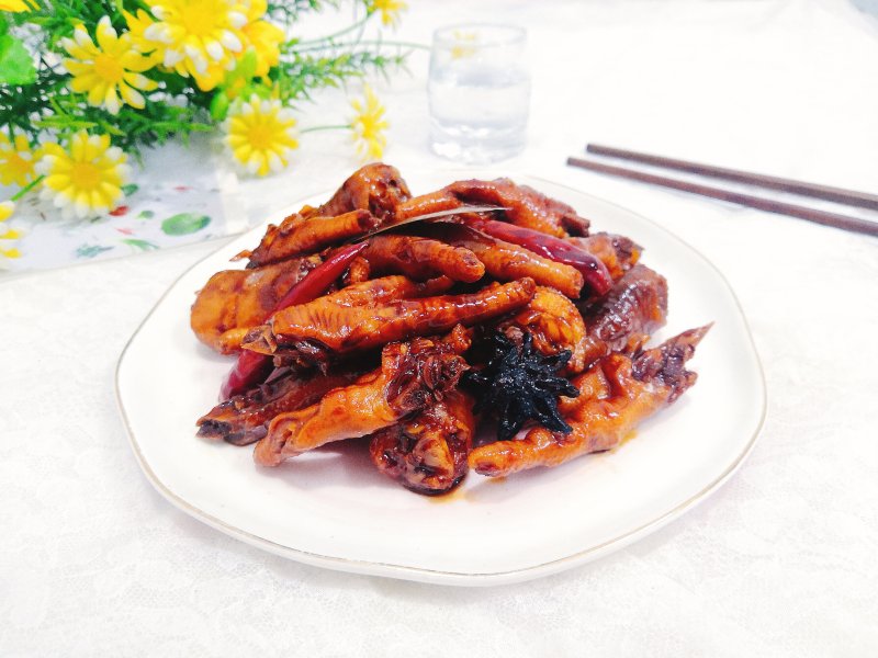 2:热锅油热后加入除盐料酒鸡粉外其他全部调料,爆香后倒入鸡爪翻炒后烹入料酒,加水没过鸡爪大火烧开转小火慢煮二十五分钟后加入盐鸡粉调味。转大火烧五分钟收汁。