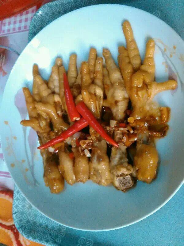 鸡爪250g;朝天椒4个;蒜头3个;姜4片;葱白5克;八角3个;