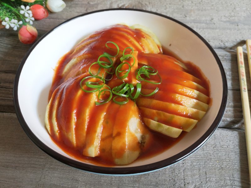7:将番茄酱汁淋在蒸好的茄子上,点缀葱花就可以上桌啦。
