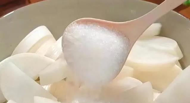 切好的萝卜扔进大碗,抓一勺白糖拌进去。白糖是秘诀,让萝卜清甜又爽口。拌匀后静置20分钟,萝卜里的水会被逼出来,变得软乎乎。