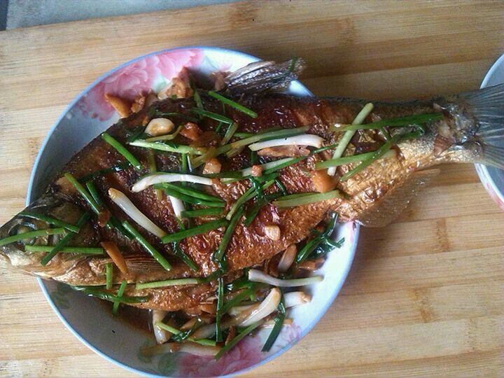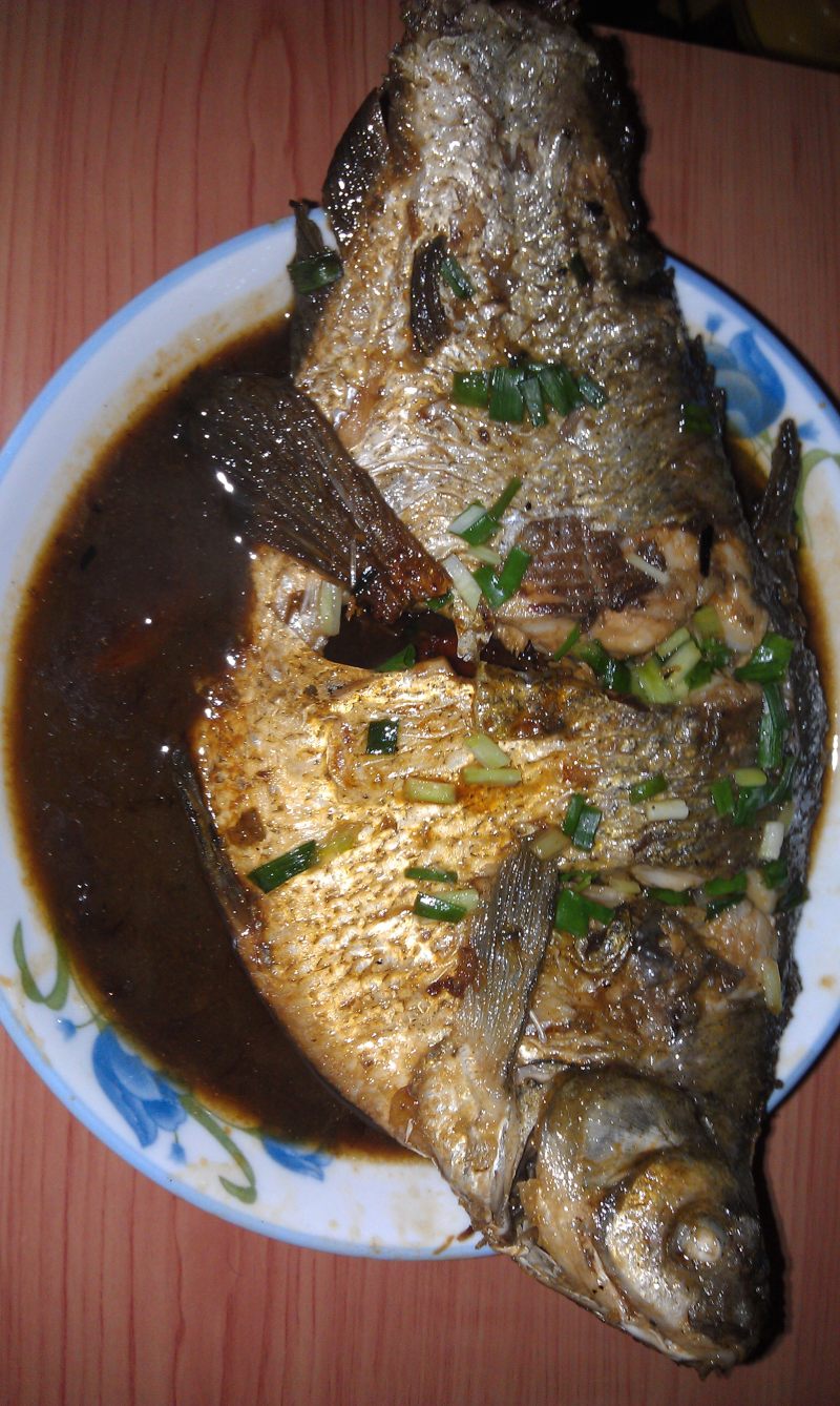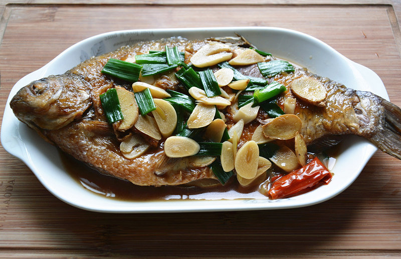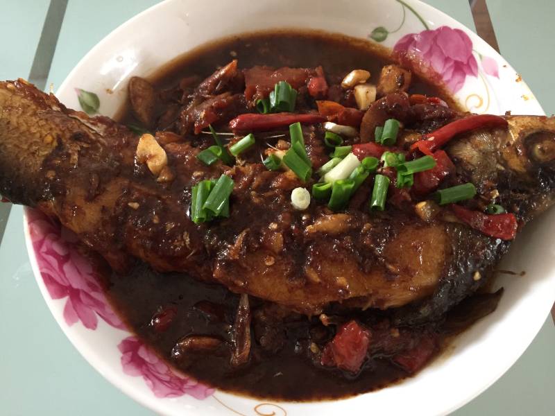 4:锅中放多些油烧热后下入鱼煎至2面微黄定型出锅,下入葱,姜,蒜煸香,加入黄豆酱小火煸香,加入适量水,酱油,鱼焖煮入味,洒上葱花既可