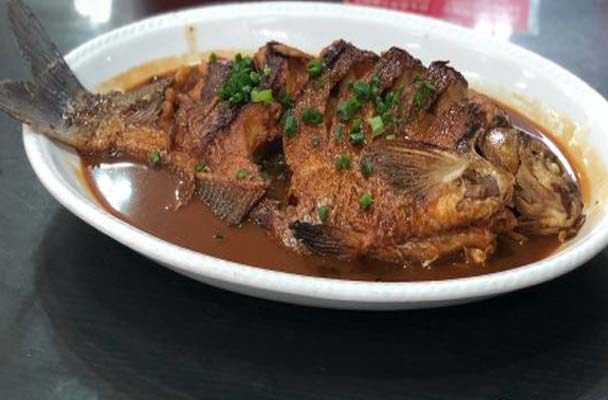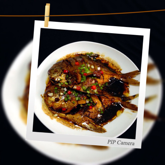 鲳鳊鱼2条;姜丝4克;香葱1棵;红辣椒1个;蒜瓣5个;料酒3ml;老抽2汤匙;盐2克;辣酱1匙;糖1克;水100ml;