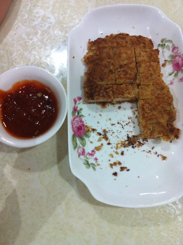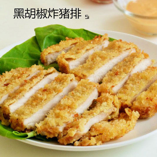 5:油烧至八成热,中火,放入大排,炸至金黄捞出,配上番茄酱或沙拉酱即可。