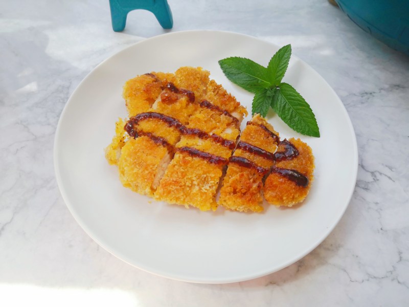 8:注意翻面,两面都要煎至金黄,即可出锅切块盛盘,再在鸡排表面挤上一些黑胡椒酱,快来品尝吧。