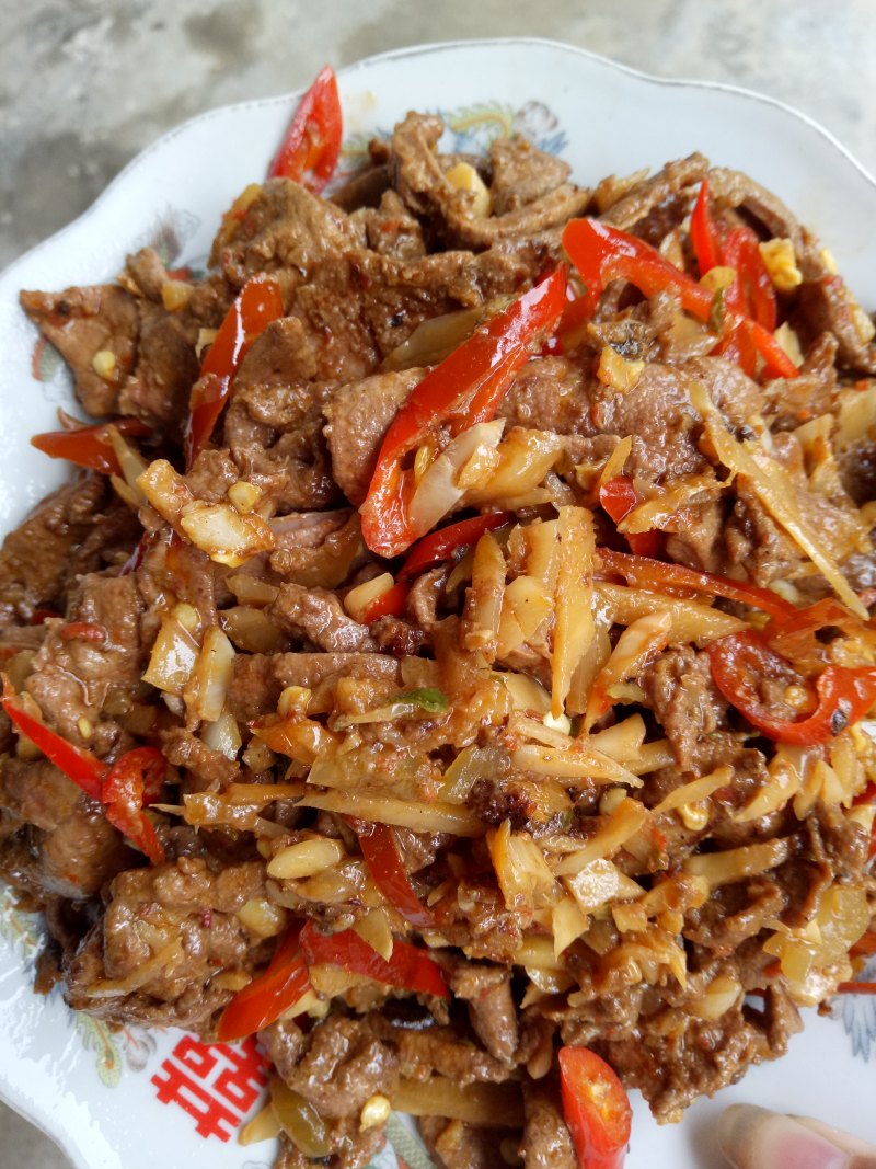4:锅中倒宽油,倒入泡辣椒和泡姜炒出香味儿,放一勺豆瓣酱炒香,倒入焯过水的猪肝迅速翻炒,倒入配菜快速加盐,酱油出锅。