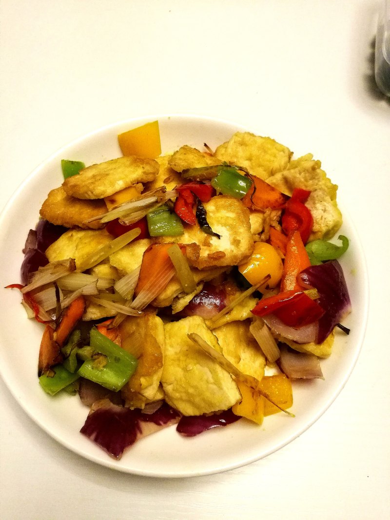 6:翻炒让豆腐都均匀上色就可以出锅。