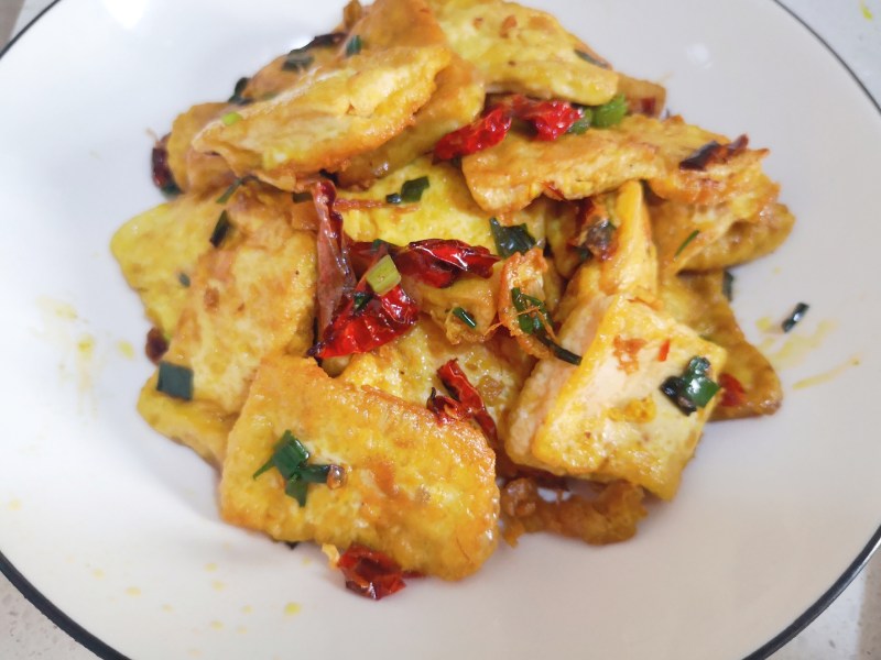 4:再下葱花,干辣椒爆香后加入豆腐块,翻炒均匀。