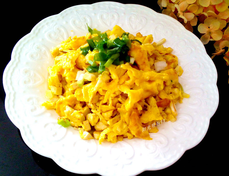 7:成品图,鸡蛋包裹上豆腐粒。色泽金黄。