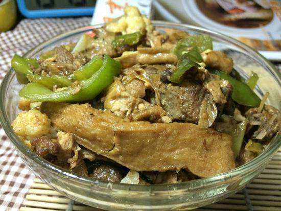 鸭肉300g;菜花半个;油豆腐干6片;猪肉50g;