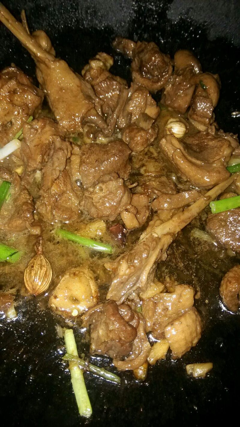 8:倒入高压锅压好的鸭肉翻炒均匀