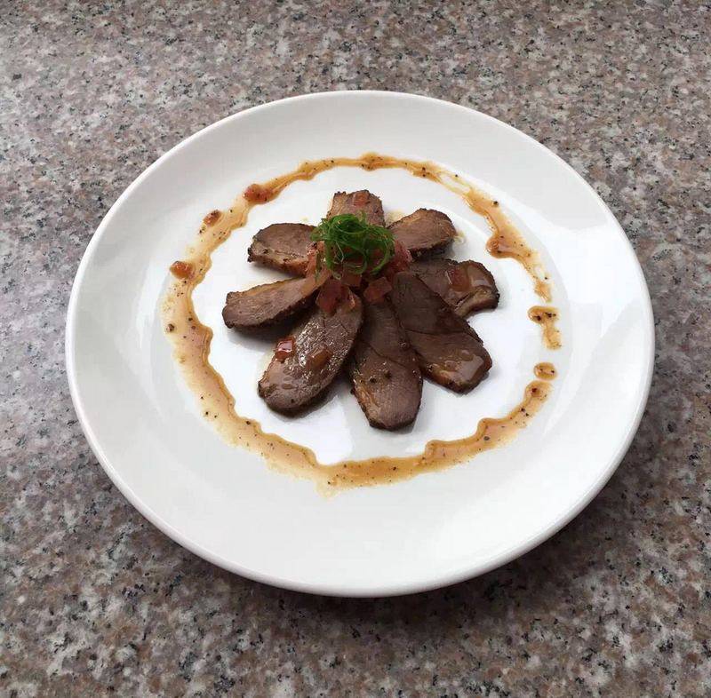 4:取出鸭胸切片装盘淋上酱汁点缀一些葱丝