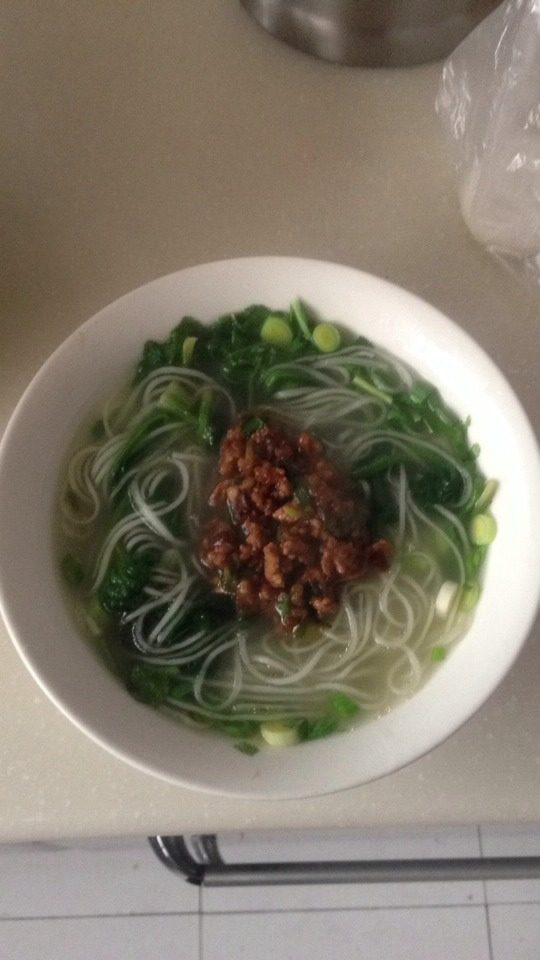 6:碗中放香菜和香油,先将米线捞出,再加入高汤,菠菜摆放碗中,最后将肉酱放碗中。香喷喷的米线出锅了,在冬日里既营养又暖身。