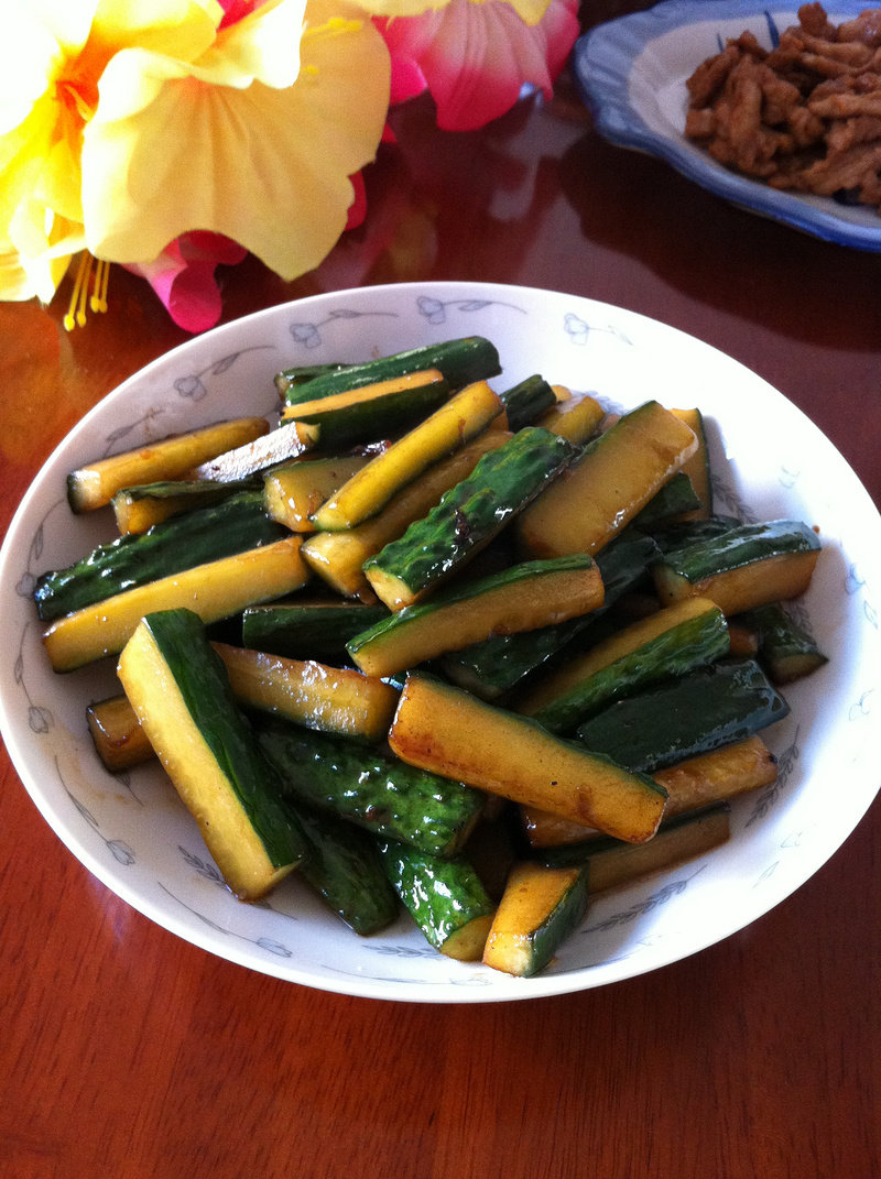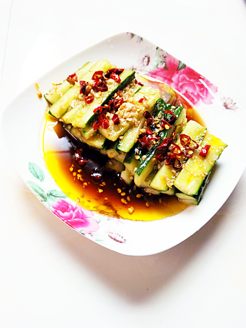 一般凉拌黄瓜都用芝麻油,淋上几滴就行了。我用的是菜油,是正宗的压榨纯香菜籽油。菜油爆出的辣椒籽再浇在黄瓜上觉对是香味十足。其它油都行,不过没这个香纯了。