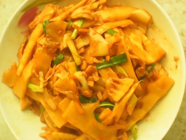 5:加入竹笋继续翻炒,然后下入豆瓣上色。撒上葱花、味精即成。