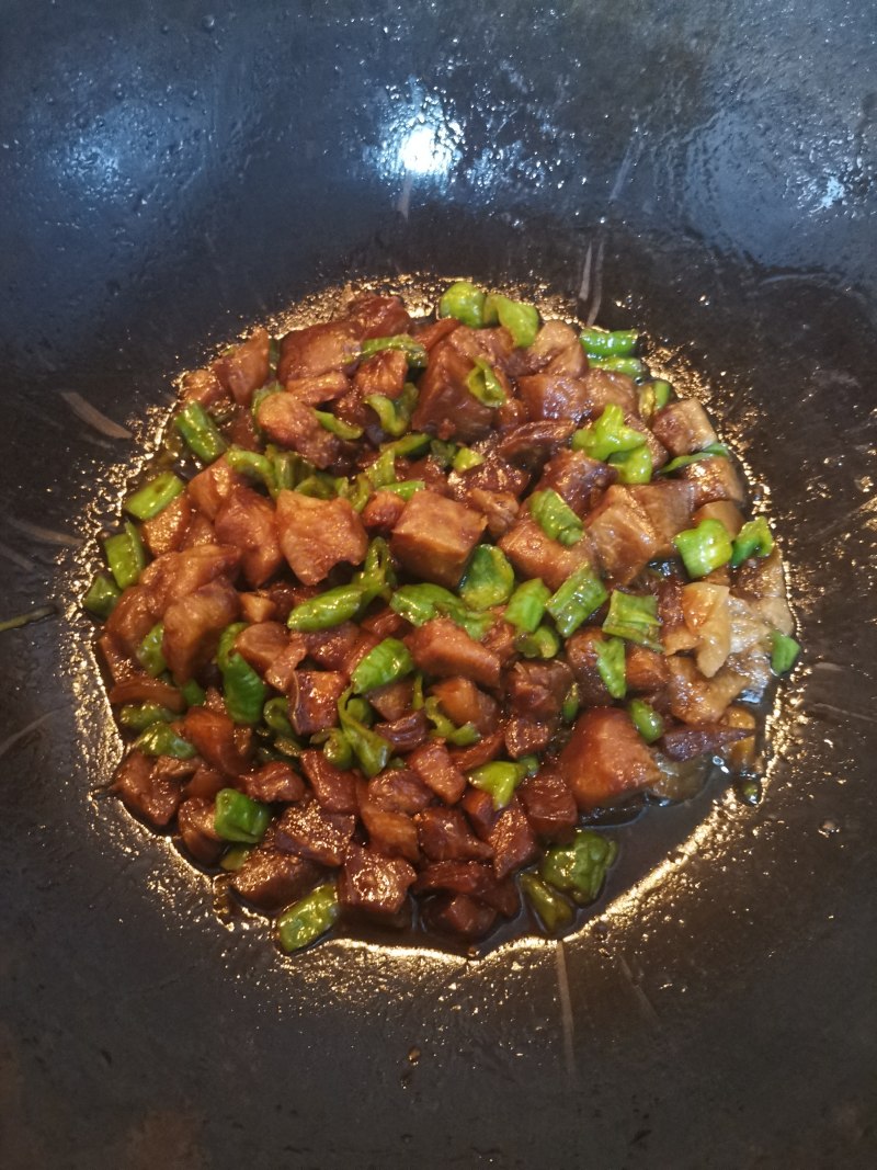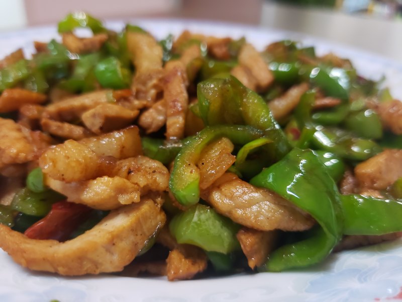 5:锅烧热放少许油,倒入肉丝加少许老抽煸炒,再倒入尖椒加适量盐和少许五香粉,翻炒片刻即可。
