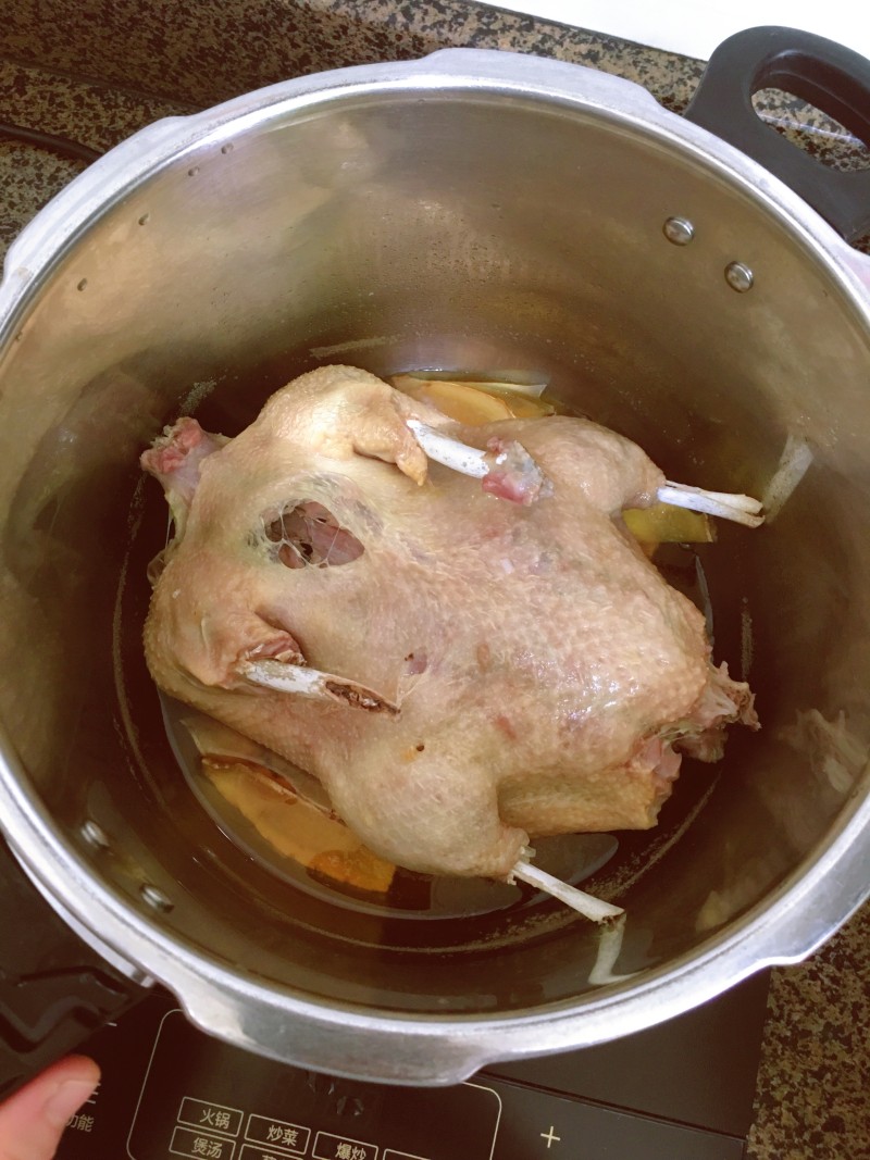 6:听到声音大火10分钟,换中火10分钟,煮的过程注意不要煮焦,也不能剩下太多水,煮的过程怕焦可以先15钟关火开盖看看情况,煮到姜片微微发黄最好吃,没有任何水分只剩下油,鸭肉轻轻一扯就掉。
