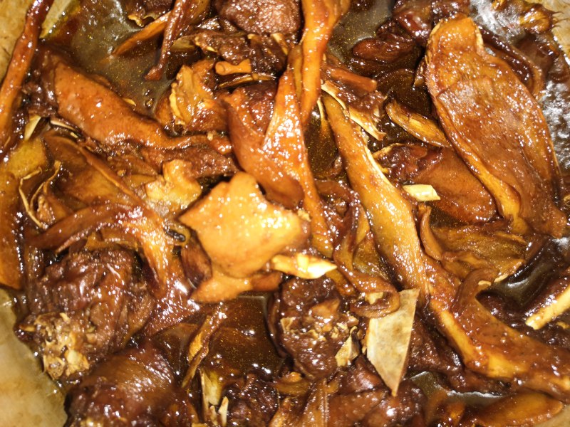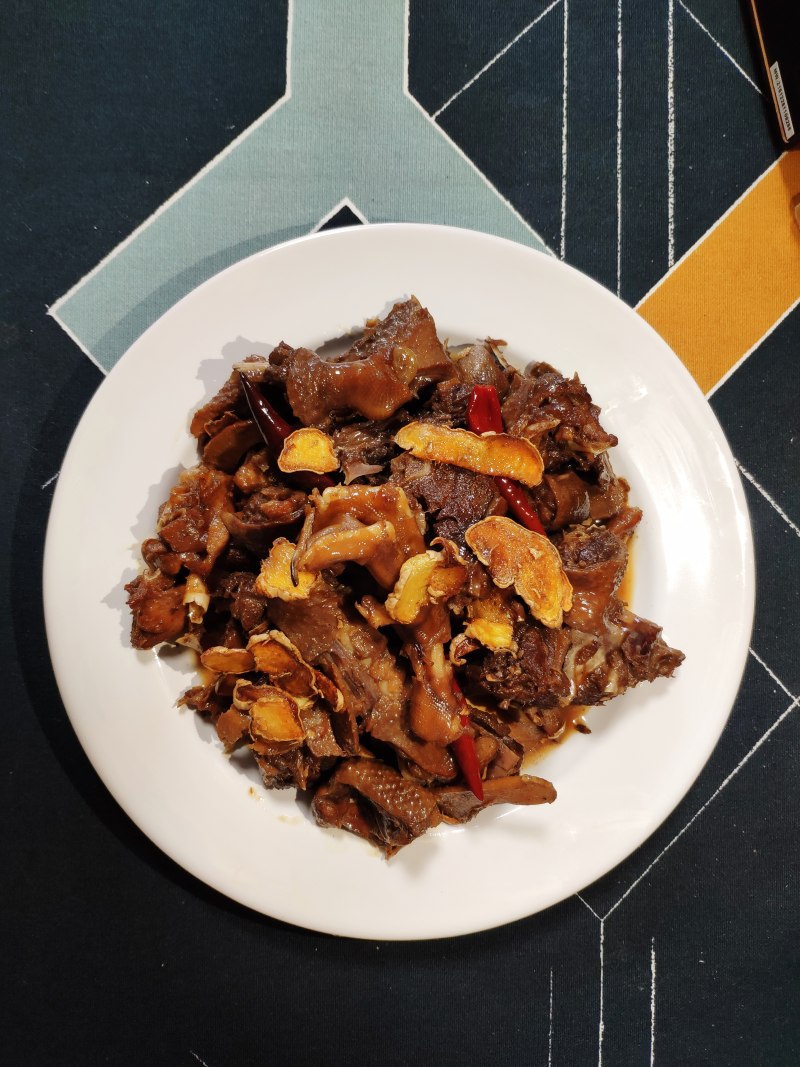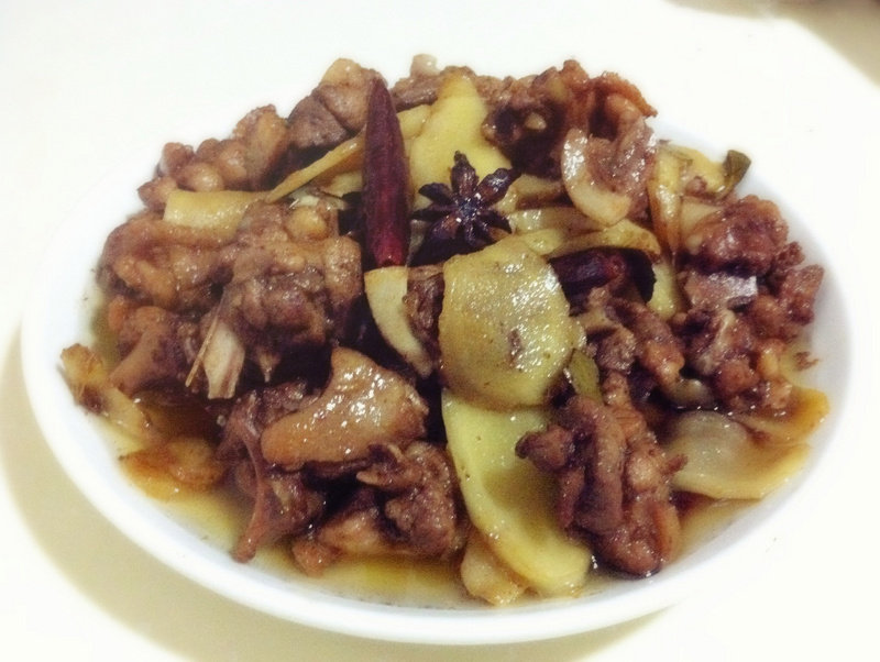 黄姜两大坨;老抽1勺;生抽3-4勺;料酒少许;芝麻油适量;盐少许;冰糖几颗;干辣椒适量;香叶适量;八角适量;桂皮适量;
