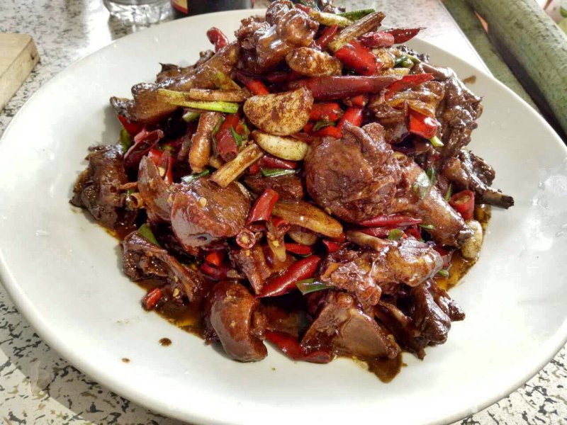 2:取子鸭半个切丁,姜和辣椒切丝,蒜切片。