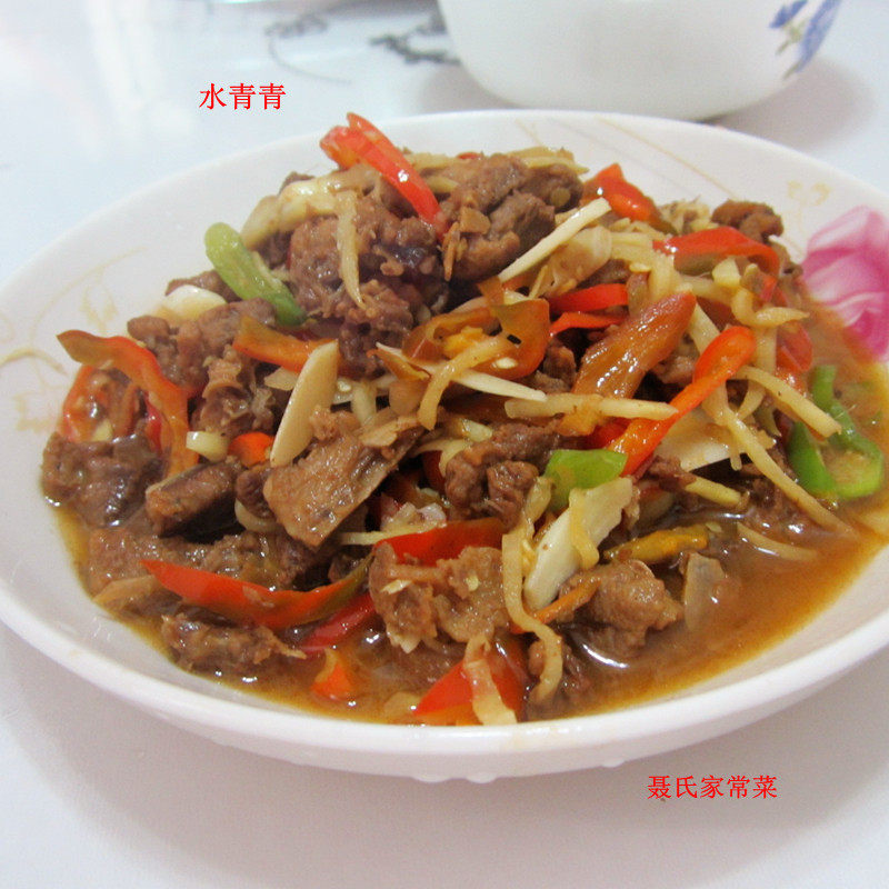 鸭血倒入之后必须快速翻炒以入味时间长了鸭血炒干影响口感而且容易粘锅