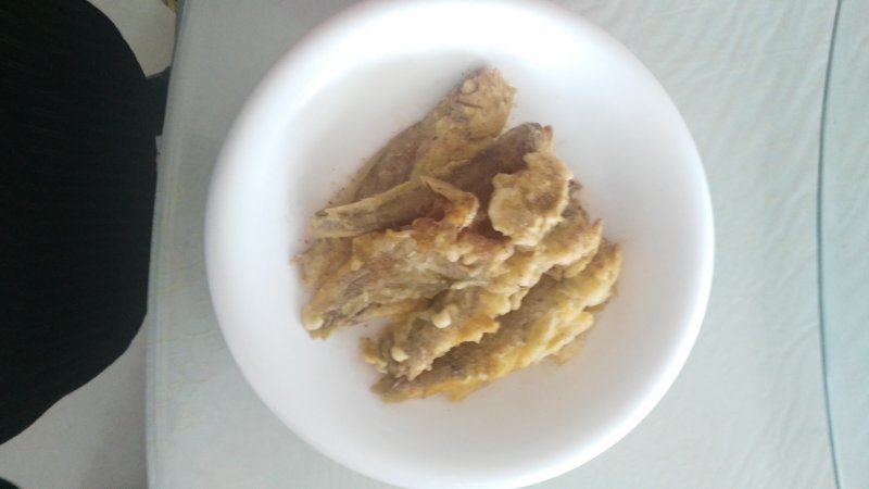 4:将小黄鱼裹住调好的全蛋糊,(叫小黄鱼里的水空干)