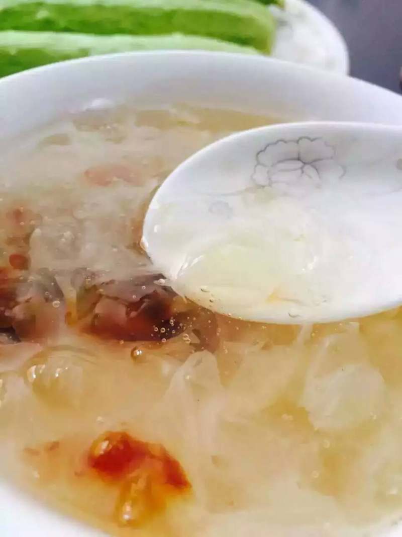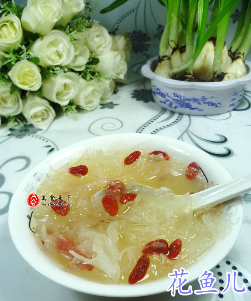 4:快煮好时放入冰糖,红枣,枸杞.冰糖放入后,搅拌,待几分钟后,香滑美味的养颜汤可以出锅了。也可放入冰箱中冷却后食用。