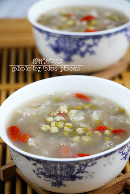 1、菜谱中所用的水均为凉水,泡银耳的水若想节省时间可改用微温的水。2、天热时浸泡绿豆和银耳要放在阴凉地方,偶是为了省事泡一夜后早上做的,实际泡几个小时也可。
