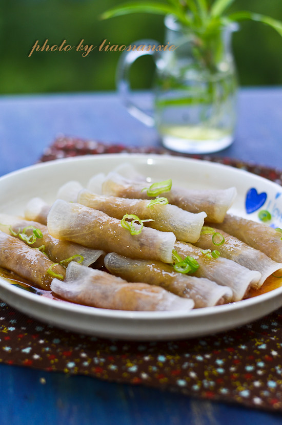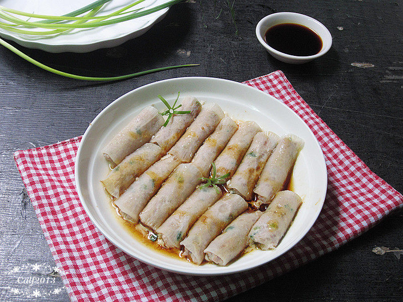 8:8、蒸好后淋生抽。不怕麻烦的话,可以将蒸出来的汤水倒入小锅中,烧开勾芡再浇在肉卷上。