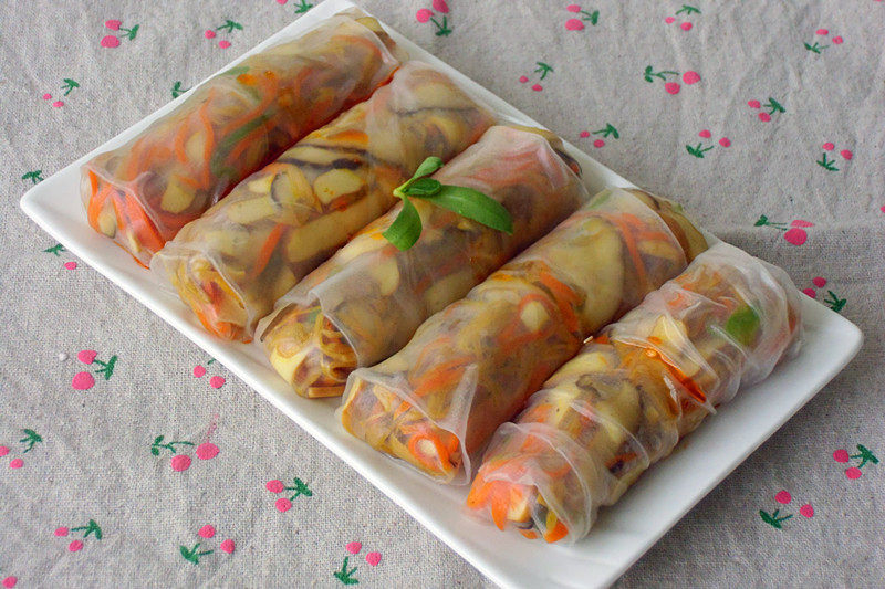 香菇10朵;胡萝卜1根;豆腐干5片;青椒1个;黄花菜适量;越南春卷皮适量;