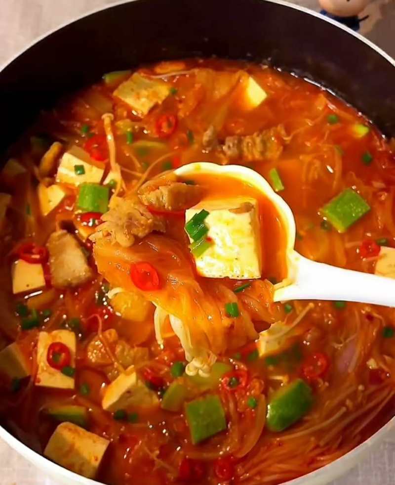 3:步骤三:豆腐平铺在辣白菜之上步骤四:西红柿切块平铺在豆腐之上步骤五:加少许料酒,干锅烧至葱姜蒜出香味为止(大致时间2-3分钟)步骤六:加入淘米水,没过食材多出三分之一即可。加入韩式辣酱一勺,韩国大酱一勺,食盐少许 白砂糖少许 大火煮沸 转文火煮至15分钟即可 出锅前5分钟加入蛤蜊!