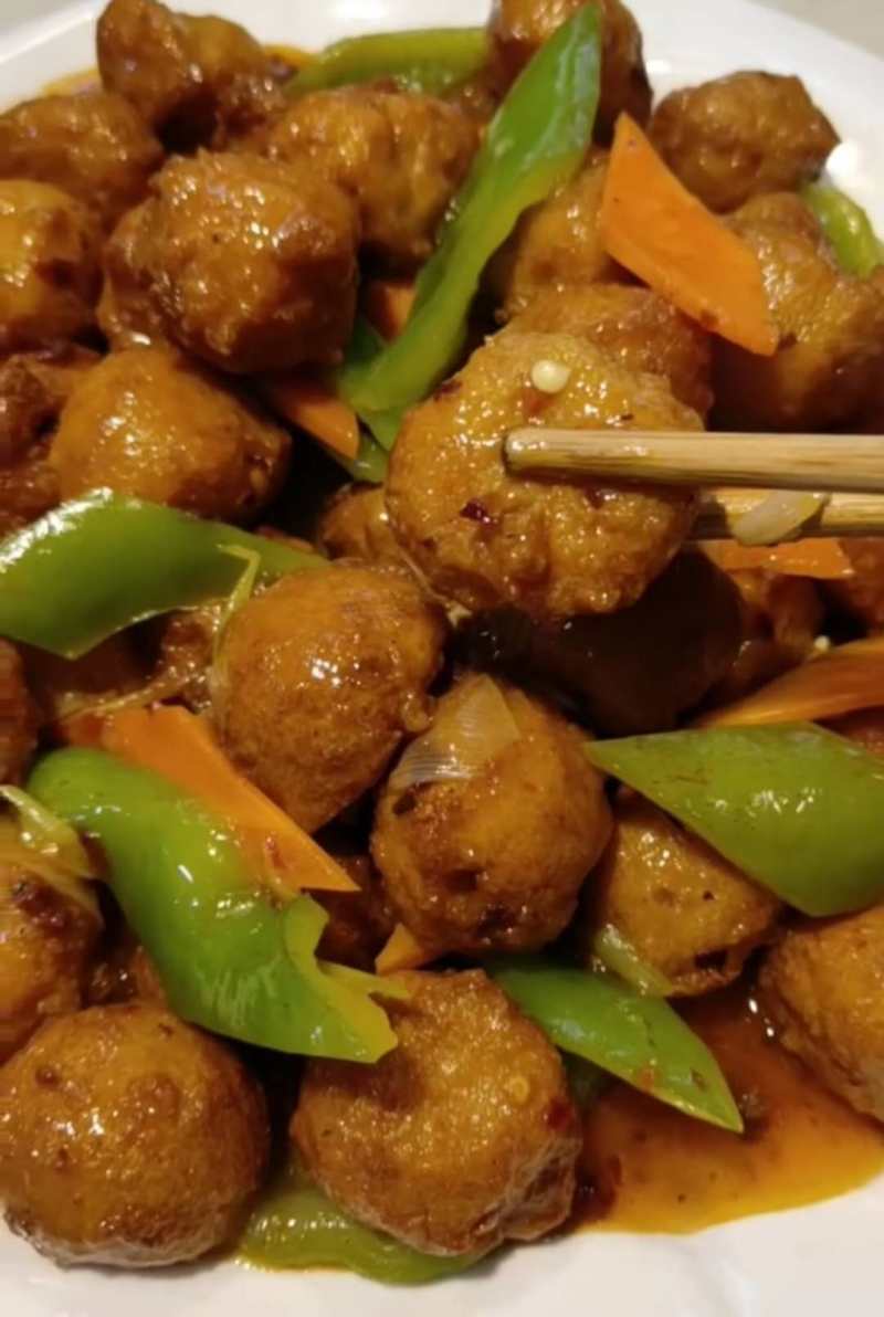 2:起锅烧油,豆腐泥用手挤成丸子下锅炸至熟透捞出,二次下锅复炸一小会,保证丸子的外酥里嫩,锅留底油放入葱末、蒜片炒香,加入辣椒油、青椒、胡萝卜炒熟,倒入清水,加入盐、十三香煮开,淋上水淀粉勾芡。
