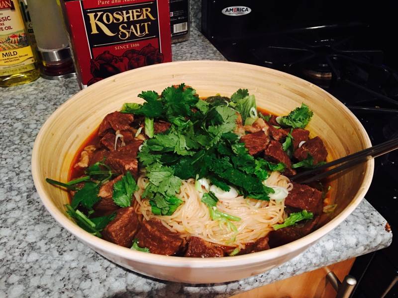 3:米粉开水烫好以后浇上牛腩肉和汤。