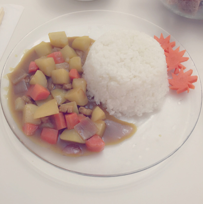 3:倒入油,猪肉煸炒,放入料酒,酱油,土豆胡萝卜放入反差,加水,沫过,放入咖喱块,快要熟了的时候放入洋葱,收汁。ok