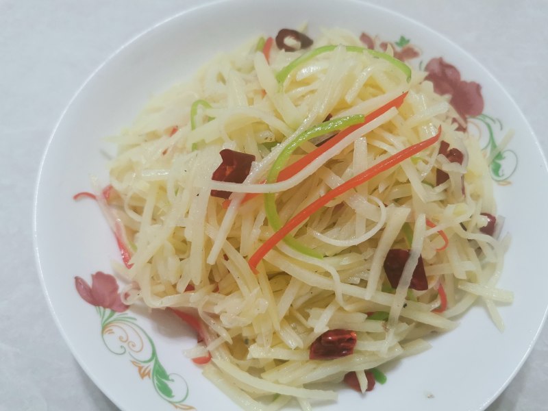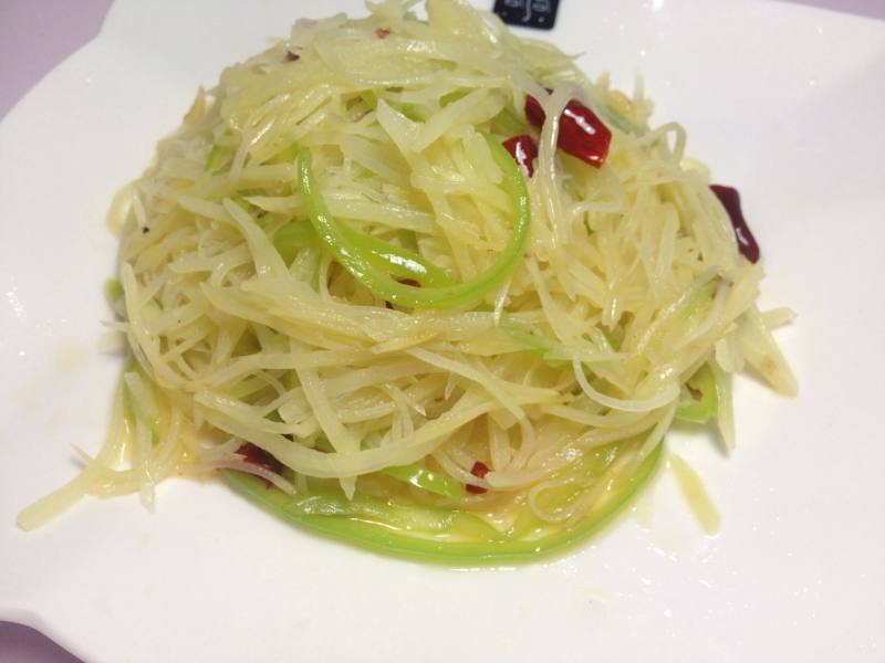 1.土豆丝要切的细些,不要炒的太酥。2.土豆丝要用清水漂去掉淀粉,炒的时候才不容易粘锅.3.成品图片上的红椒丝是装饰用的.