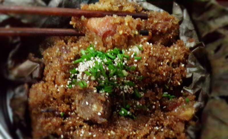 6:将荷叶在蒸笼上摊平,将拌匀的米粉排骨倒入荷叶中
