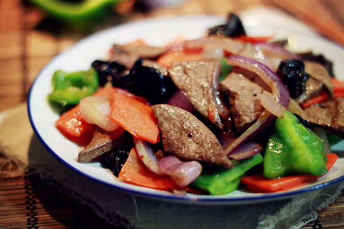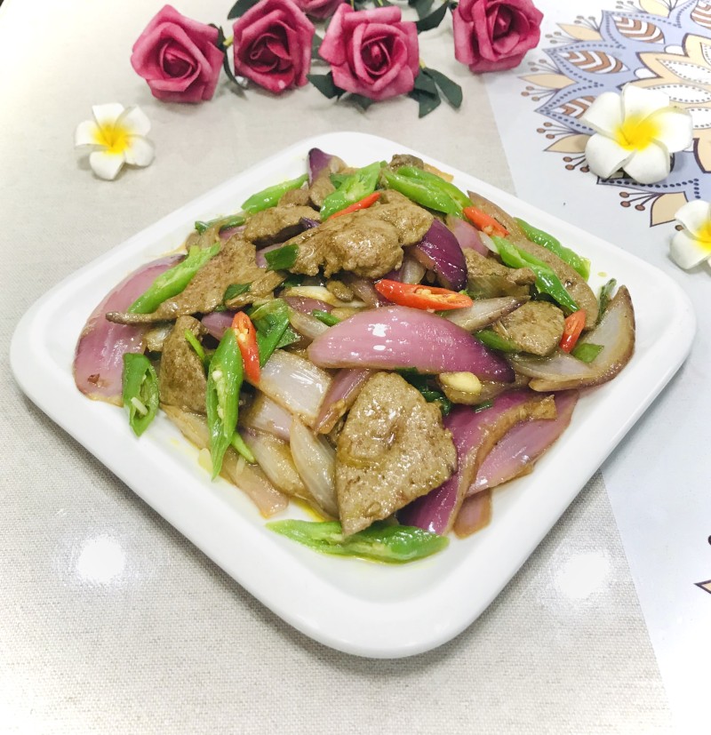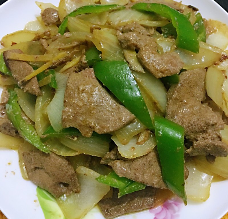 4:锅里放油,倒入洋葱翻炒一下再倒入猪肝炒,快熟时加些青椒。
