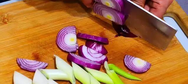 葱和洋葱得提前备好。葱斜着切成段,洋葱切成条,放在一边等着。别小看这两样,它们炒出来能让羊肉香上加香!