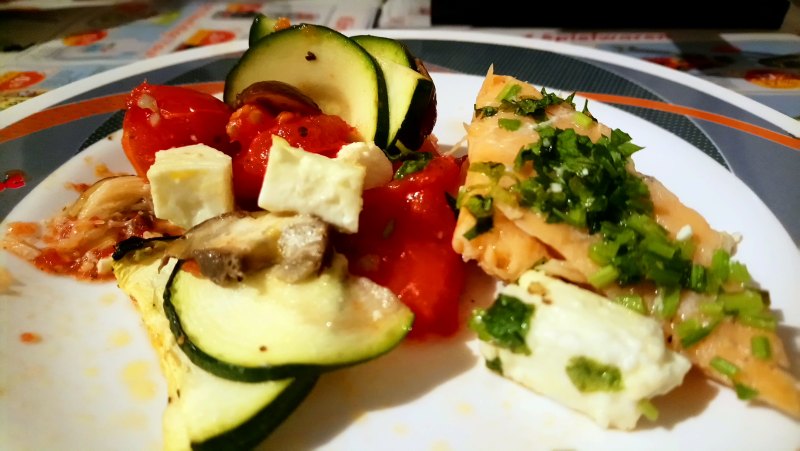 三文鱼300克;西葫芦半个;番茄两个;彩椒一个;口蘑250克;羊奶酪200克;