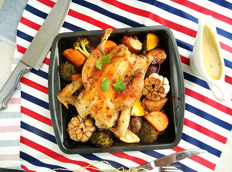 10:鸡表面抹一层厚厚的香料黄油,入烤盘,,剩下的配菜围在鸡的周围