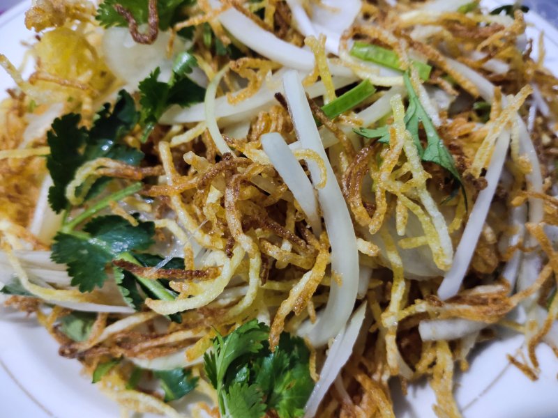 7:加入洋葱丝香菜段,盐、糖、陈醋。