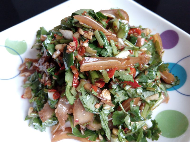 1:食材:熟猪耳朵、香菜(已洗净切段)