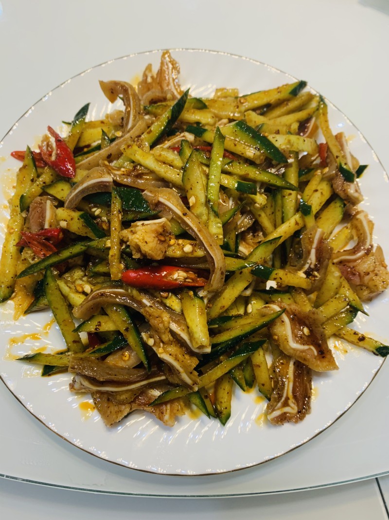 3:将猪耳、黄瓜、青红椒、洋葱切丝