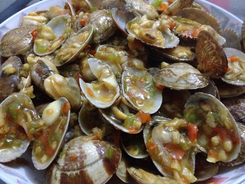 5:辣椒炒香后,把花甲倒进去炒,加盐、加酱油。