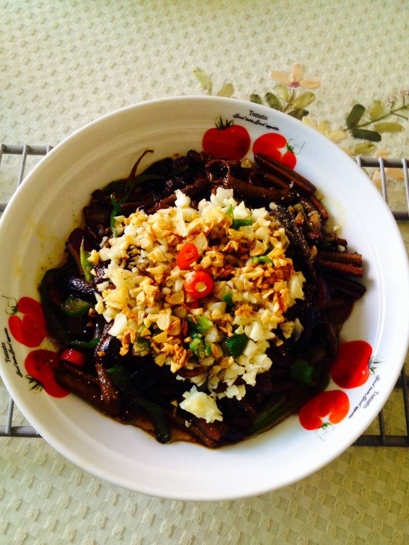 4:炒锅倒入苏北菜籽油,将姜丝煸炒出香味,再放鳝丝翻炒,用老抽上色,出锅前烹入黄酒,洋葱丁,青椒丝,闷烧片刻加少许生粉出锅。在盘中鳝丝上面,铺蒜蓉和胡椒粉。