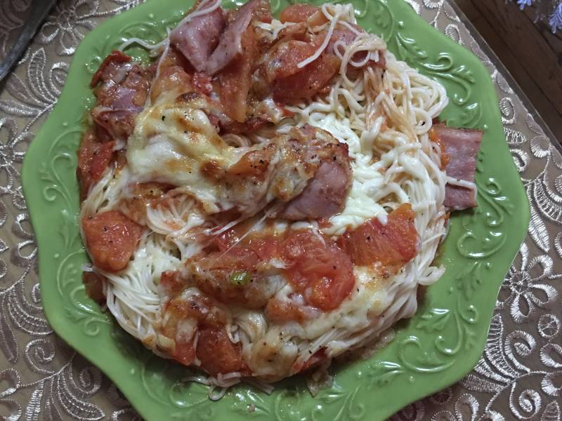 放入烤盘时炒熟的番茄分两层放,最下面和最上面,面夹在中间,一是为了给面入味,二是防止烤制时面糊了!鸡蛋也可以煎熟放在面上!