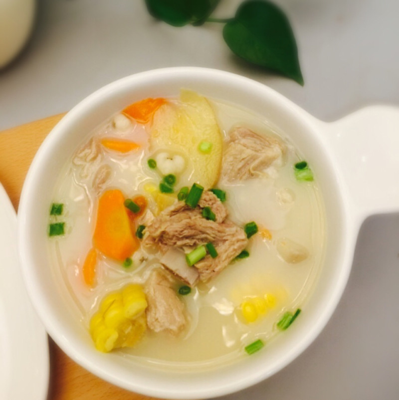 9:在炖到一小时的时间加入薏米,在炖到两小时的时间加玉米和山药块和胡萝卜块(山药用的时候再切,早切好容易氧化变黑)在炖两个半小时加洗净的枸杞子,再炖半小时就可以了,加入适量的盐调味,总共用时3小时