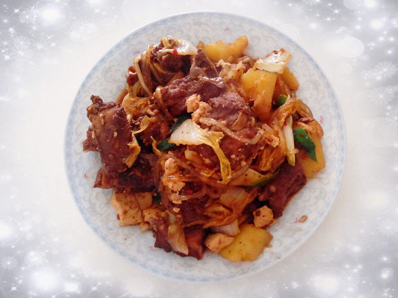 13:时间到了,排骨的汤汁也收的差不多了,放入土豆、豆腐和白菜,不用怕糊锅,因为白菜一会还会出汤的。现在开始放盐,如果提前放盐,排骨会炖不烂的。