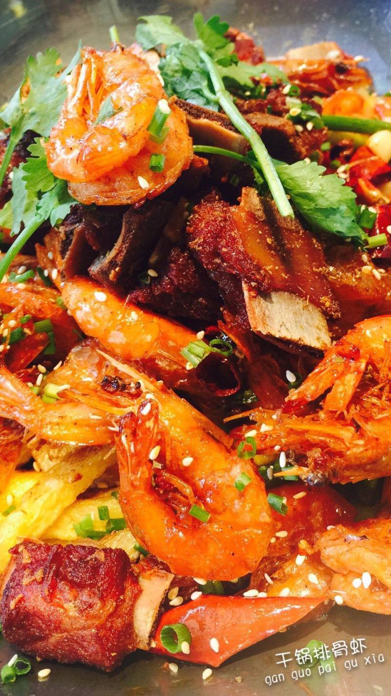 虾500g;排骨500g;土豆条适量;红椒适量;青椒适量;洋葱适量;