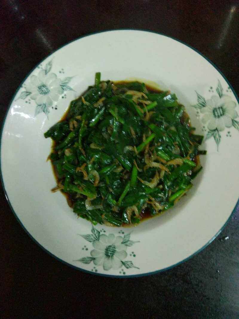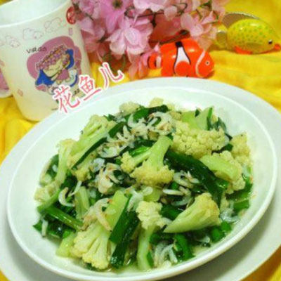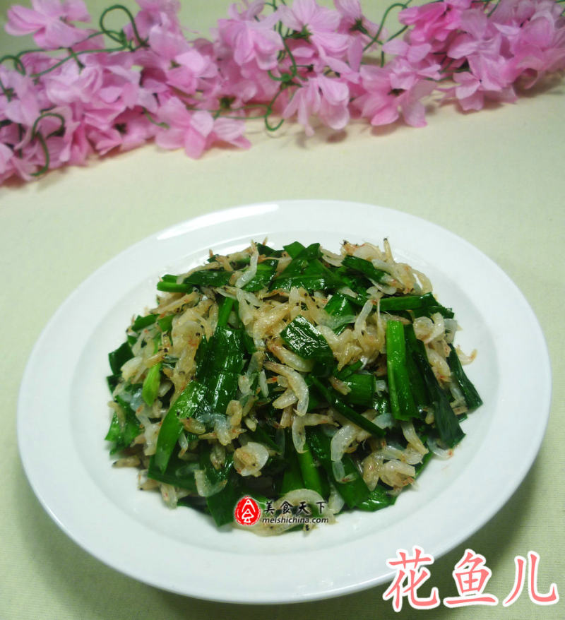 1:食材:花菜、韭菜(已洗净切成段)、虾皮